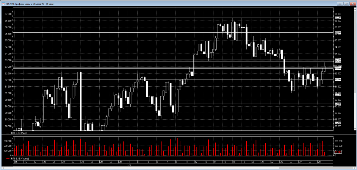 На торгах в пятницу 29 июля индекс смог пробить уровень сопротивления 91000. Закрытие торгов прошлого торгового дня произошло на уровне 93030. На сегодня, понедельник 01 августа в качестве первого сопротивления возьмем диапазон 93410-93590. В случае его пробоя, следующим сопротивлением уже будет 94440. Уровни поддержки 1 и 2 на сегодня будут - 92880-92970 и 89940-90190 соответственно.